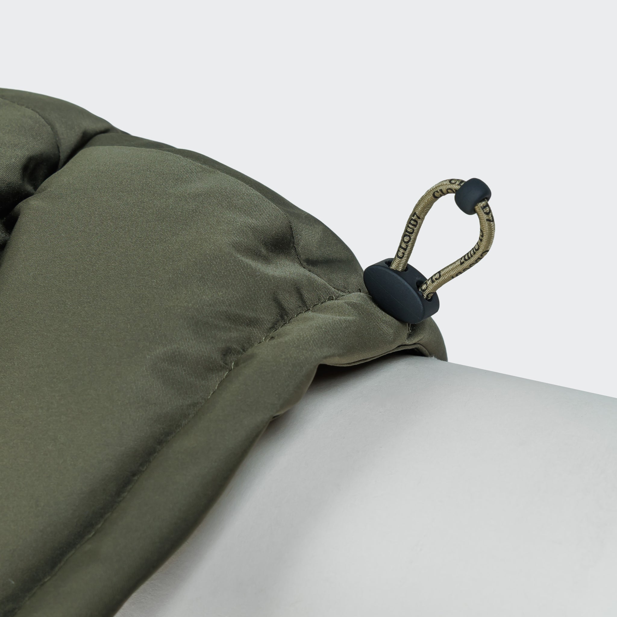 Veganer Hundemantel aus 100% nachhaltigen Materialien. Die extra warme Winter Hundejacke in Light Olive ist anstelle von Daunen mit Eco Puffer aus recycelten PET-Flaschen gefüttert.