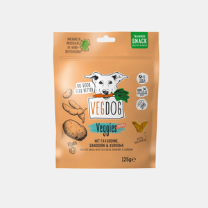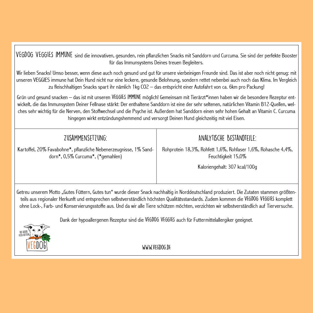 VEGDOG VEGGIES immune sind die innovativen, gesunden, rein pflanzlichen Snacks mit Sanddorn und Curcuma. Sie sind der perfekte Booster für das Immunsystems Deines treuen Begleiters. Wir lieben Snacks! Umso besser, wenn diese auch noch gesund und gut für unsere vierbeinigen Freunde sind. Das ist aber noch nicht genug: mit unseren VEGGIES immune hat Dein Hund nicht nur eine leckere, gesunde Belohnung, sondern rettet nebenbei auch noch das Klima. Im Vergleich zu fleischhaltigen Snacks spart ihr nämlich 1kg CO2 - das entspricht einer Autofahrt von ca. 6km pro Packung! Der enthaltene Sanddorn ist eine der sehr seltenen, natürlichen Vitamin B12-Quellen, welches sehr wichtig für die Nerven, den Stoffwechsel und die Psyche ist. Außerdem hat Sanddorn einen sehr hohen Gehalt an Vitamin C. Curcuma hingegen wirkt entzündungshemmend und versorgt Deinen Hund gleichzeitig mit viel Eisen. Dank der hypoallergenen Rezeptur sind die VEGDOG VEGGIES auch für Futtermittelallergiker geeignet.
